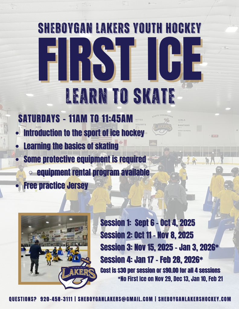 Also, if you do not have skates, you can use our public skating skates free of charge during the First Ice practice. These need to be checked out each time and returned the same day. Get them at the Public Skating skate rental window.
